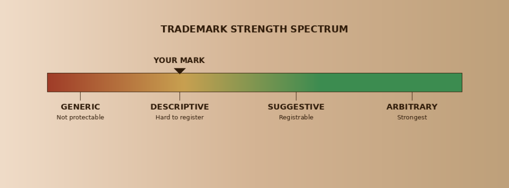 The law requires marks to be distinctive, not just accurate. The more your mark describes your offering, the weaker it is as a trademark — and the more likely it is to face this refusal.